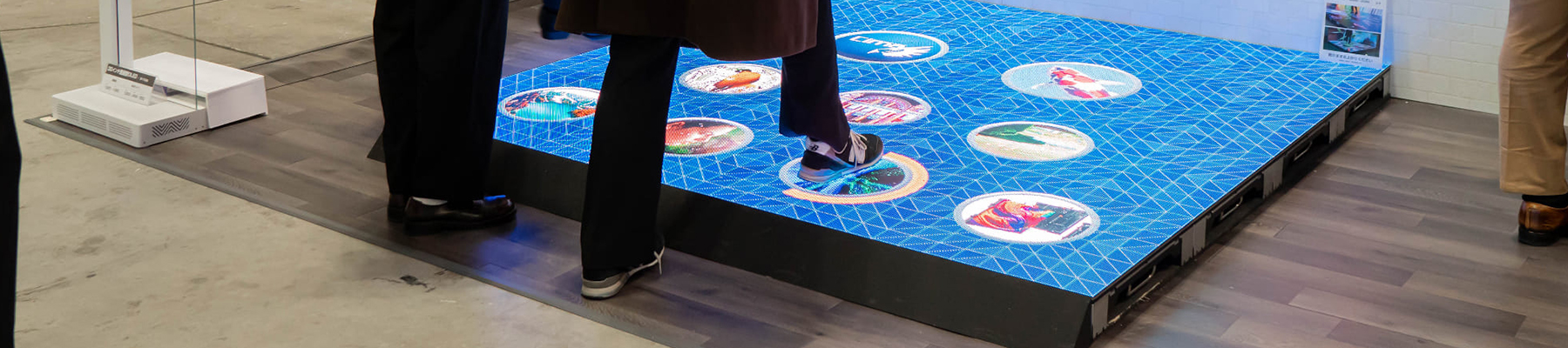 ブースでまず目を引いたのは、床一面に広がる映像です。来場者が映像の上を歩くと、泳ぐ魚や丸いアイコンが足元で反応し、まるで映像と対話しているかのようなインタラクティブ体験を展示しました。このフロアLEDは1㎡あたり2,000kgの耐荷重を誇り、車両を乗せることも可能。さらに3.9mmピッチのLED素子を採用し、500mm角のパネルを組み合わせることで施設の規模や演出に応じた自由なレイアウトが可能です。